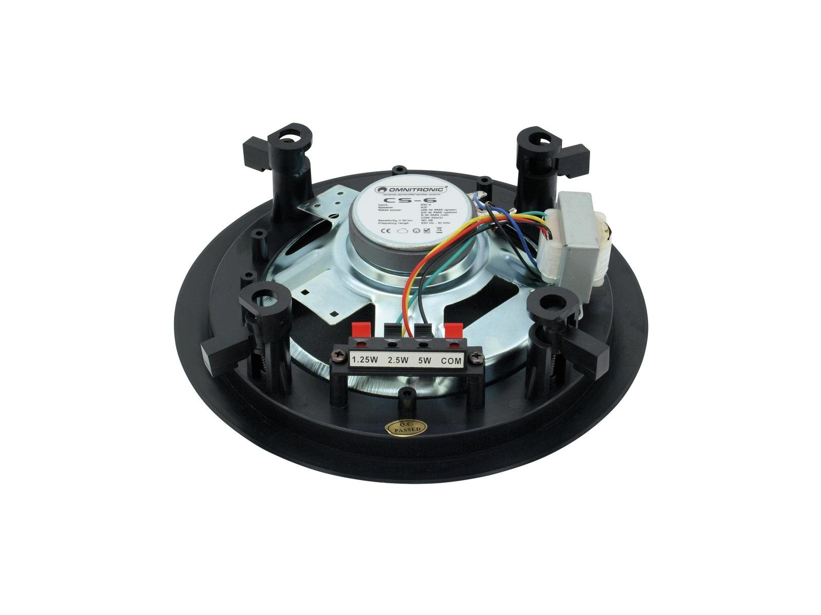 Home INDOOR PUBLIC ADDRESS SPEAKERS OMNITRONIC CS-6 Ceiling Speaker black OMNITRONIC CS-6 Ceiling Speaker black SKU: 80710221 37,02 € Desconto de %. IVA incluído. Comprar Contactar Adicionar à wishlist 6.5" full-range flush-mount speaker, 100 V, 5 W RMSFor speech and background music in indoor PA systemsScratchproof and shockproofPackage contents1 x device, 1 x user manualPower:Program: 10WRated: 5W RMSFrequency range:100 - 10000 HzSensitivity:90 dB (1W/1m)Impedance:Public address systems 100VPower tapping:1,25W; 2,5W; 5W RMS via Spring terminal switchableSpeaker:1 x woofer (6.5") approx. 17 cmType of speaker:Flush-mount speakerMaterial:ABS Acrylonitrile butadiene styreneColor:Black, scratchproof and shockproofMounting dimensions:Ø 19,5 cmDimensions:Depth: 7 cmDiameter: Ø 23 cmWeight:740 g Marca Omnitronic Tags OMNITRONICCS-6CeilingSpeakerblackPalestranteteto Características Partilhar