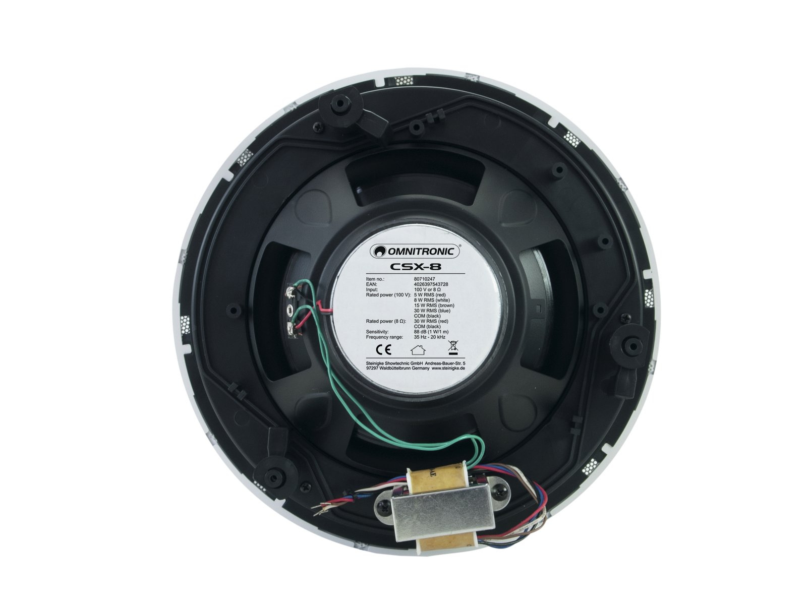 Home INDOOR PUBLIC ADDRESS SPEAKERS OMNITRONIC CSX-8 Ceiling Speaker white OMNITRONIC CSX-8 Ceiling Speaker white SKU: 80710247 84,13 € Desconto de %. IVA incluído. Comprar Contactar Adicionar à wishlist 2-way coaxial speaker (Ø 245 mm), LF: 8" HF: 0.5", 100 V, 30 W RMS2-way coaxial speaker with excellent sound qualitySwivel tweeterFor speech and background music in indoor PA systemsEasy installationScratchproof and shockproofWhite metal grillePackage contents1 x device, 1 x user manualPower:Program: 90WRated: 45W RMS (8 ohms)Rated: 30W RMS (100V PA)Frequency range:35 - 20000 HzSensitivity:89 dBMax. SPL:104 dBImpedance:Public address systems 100VSetup:Easy installationPower tapping:5W; 8W; 15W; 30W RMS via no connector/cable only switchableSpeaker:1 x woofer (8") approx. 20 cmBasket material: SteelCalottes highs (0.5") approx. 1.27 cmType of speaker:Flush-mount speakerMaterial:ABS Acrylonitrile butadiene styreneColor:White, scratchproof and shockproofMounting depth:112 mmDimensions:Depth: 11,5 cmDiameter: Ø 27,5 cmWeight:2,10 kg Marca Omnitronic Tags OMNITRONICCSX-8CeilingSpeakerwhiteFalantedetetoBranco Partilhar