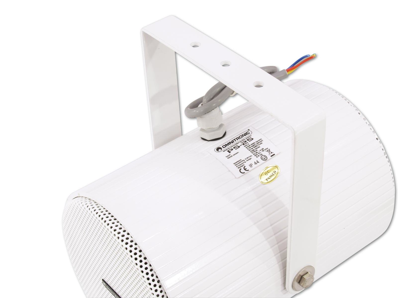 Home INDOOR PUBLIC ADDRESS SPEAKERS OMNITRONIC PS-25 Projector Speaker OMNITRONIC PS-25 Projector Speaker SKU: 80710370 97,24 € Desconto de %. IVA incluído. Comprar Contactar Adicionar à wishlist Bidirectional speaker (2 x 5") with mount 2 built-in speakers for bidirectional radiation Durable aluminum cabinet with grille With Mounting bracket Suitable for outdoor use IP44 For further information about this product, please refer to the Data Sheet under "Downloads" Package contents 1 x device, 1 x user manual, 1 x lid IP classification: IP44 Power connection: Fixed Supply cord with open wires Power: Program: 20WRated: 10W RMS Frequency range: 130 - 15000 Hz Sensitivity: 91 dB (1W/1m) Max. SPL: 101 dB Impedance: Public address systems 100V Attachment system: Mounting bracket Power tapping: 2,5W; 5W; 10W RMS via no connector/cable only switchable Speaker: 2 x woofer (5") approx. 13 cm Type of speaker: Projector speaker Material: Aluminum Color: White Dimensions: Depth: 20,5 cmDiameter: Ø 13,8 cm Weight: 2,9 kg Marca Omnitronic Tags OMNITRONICPS-25ProjectorSpeakerPalestrante Partilhar