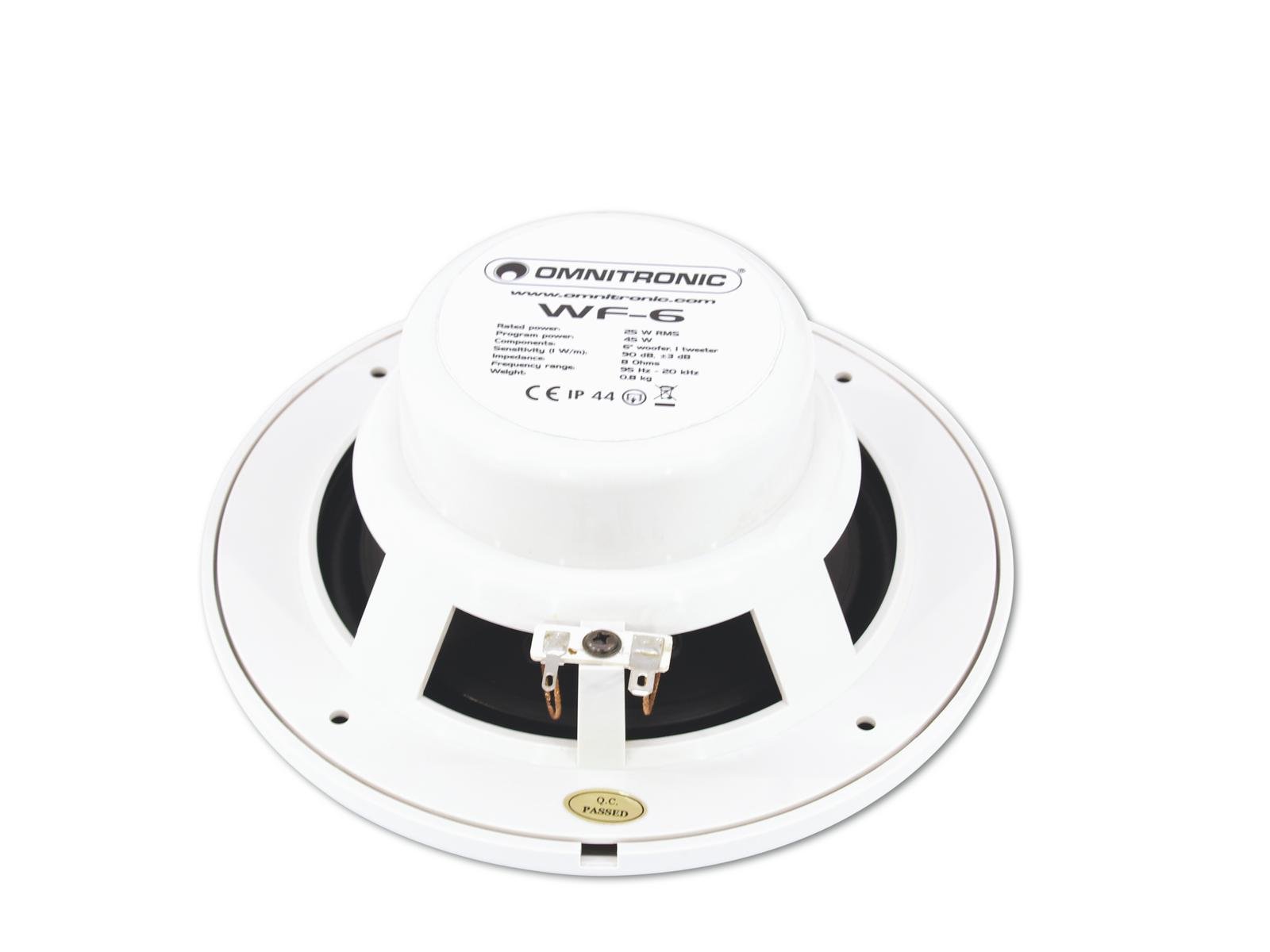 Home INDOOR PUBLIC ADDRESS SPEAKERS OMNITRONIC WF-6 Flush-Mount Speaker OMNITRONIC WF-6 Flush-Mount Speaker SKU: 80710865 69,08 € Desconto de %. IVA incluído. Comprar Contactar Adicionar à wishlist Weather-proof 2-way speaker, LF: 6" HF: 1", 25 W RMS / 8 ohms Ø 190 mm2-way system with 6" bass speaker and 2.5 cm tweeter (1")8-ohm speaker systemDurable plastic cabinetInstallation via drill holes in the housingSuitable for outdoor use IP44Package contents1 x speaker, 1 x user manualIP classification:IP44Power:Program: 45WRated: 25W RMSFrequency range:95 - 20000 HzSensitivity:90 dBImpedance:8 ohmsConnections:Solder tailSpeaker:1 x woofer (6") approx. 15 cmCompression tweeter highs (1") approx. 2.5 cmType of speaker:Flush-mount speaker; Coaxial speakerMounting dimensions:Ø 16,5 cmMounting depth:65 mmDimensions:Width: 19 cmDepth: 9 cmHeight: 19 cmWeight:780 g Marca Omnitronic Tags OMNITRONICWF-6Flush-MountSpeaker Partilhar