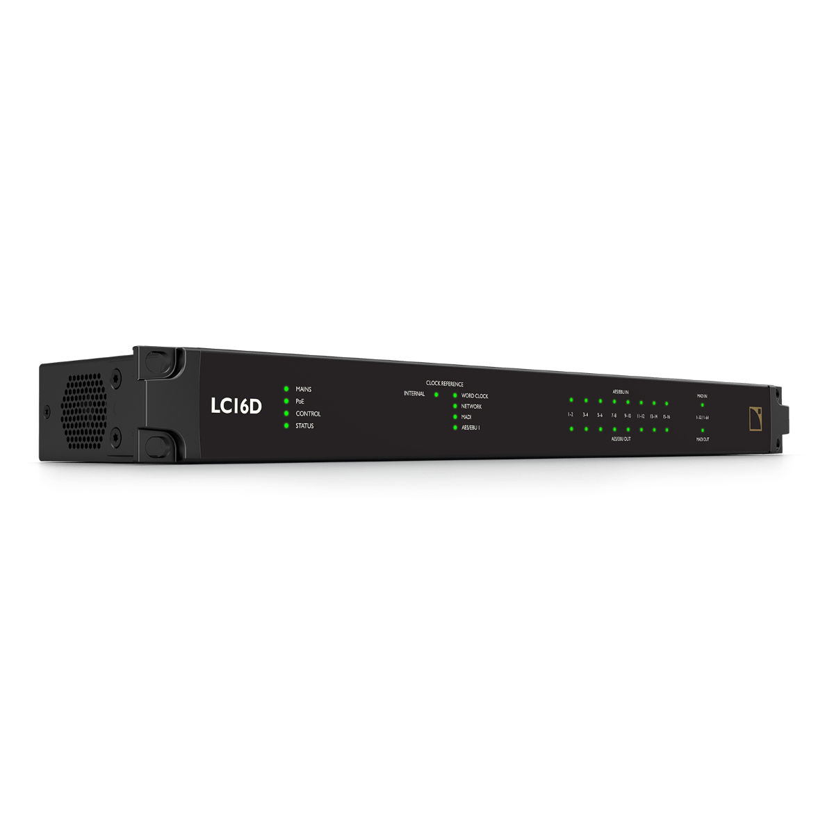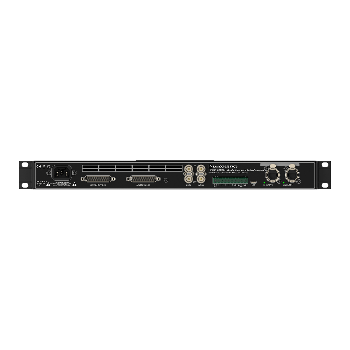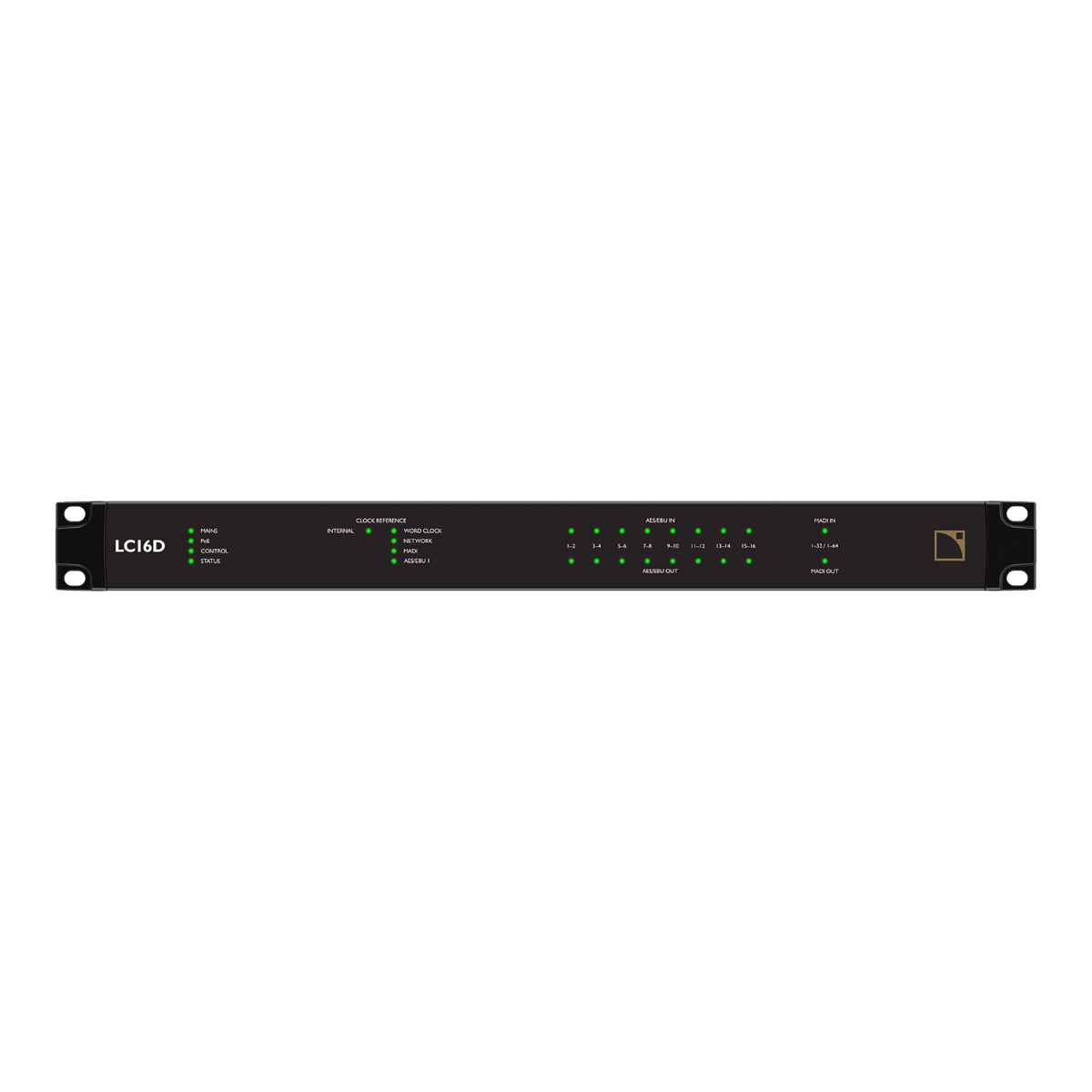 A multichannel digital audio converter bridging AES/EBU and MADI digital formats bidirectionally with a redundant Milan-AVB network. 16 AES/EBU inputs, with asynchronous sample rate converters, and 16 AES/EBU outputs are connected through DB25 connectors. 64 MADI inputs and outputs are available when the sampling rate is set to 48kHz and 32 when set to 96 kHz. MADI is connected via two BNC connectors. The 80 input sources and 80 output destinations can be dynamically mapped to and from the Milan-AVB network using 16 streams of up to 8 channels. The clock reference is selectable from any one of six sources, the selected clock source is distributed to all outputs. BNC connectors are provided for Word clock input and output. Two Ethernet connections are provided for audio, remote control, and monitoring. A combination of the internal PSU and the dual, PoE-supporting, Ethernet ports provide power redundancy. Remote control and monitoring are accomplished via an embedded web interface accessible from any device with a web browser, with 10 user configuration memory locations available. A 10-point terminal block connector provides configurable GPIOs and 12V DC output. Housed in a compact and rugged 1RU chassis, heat is dissipated by a low noise temperature-controlled fan.