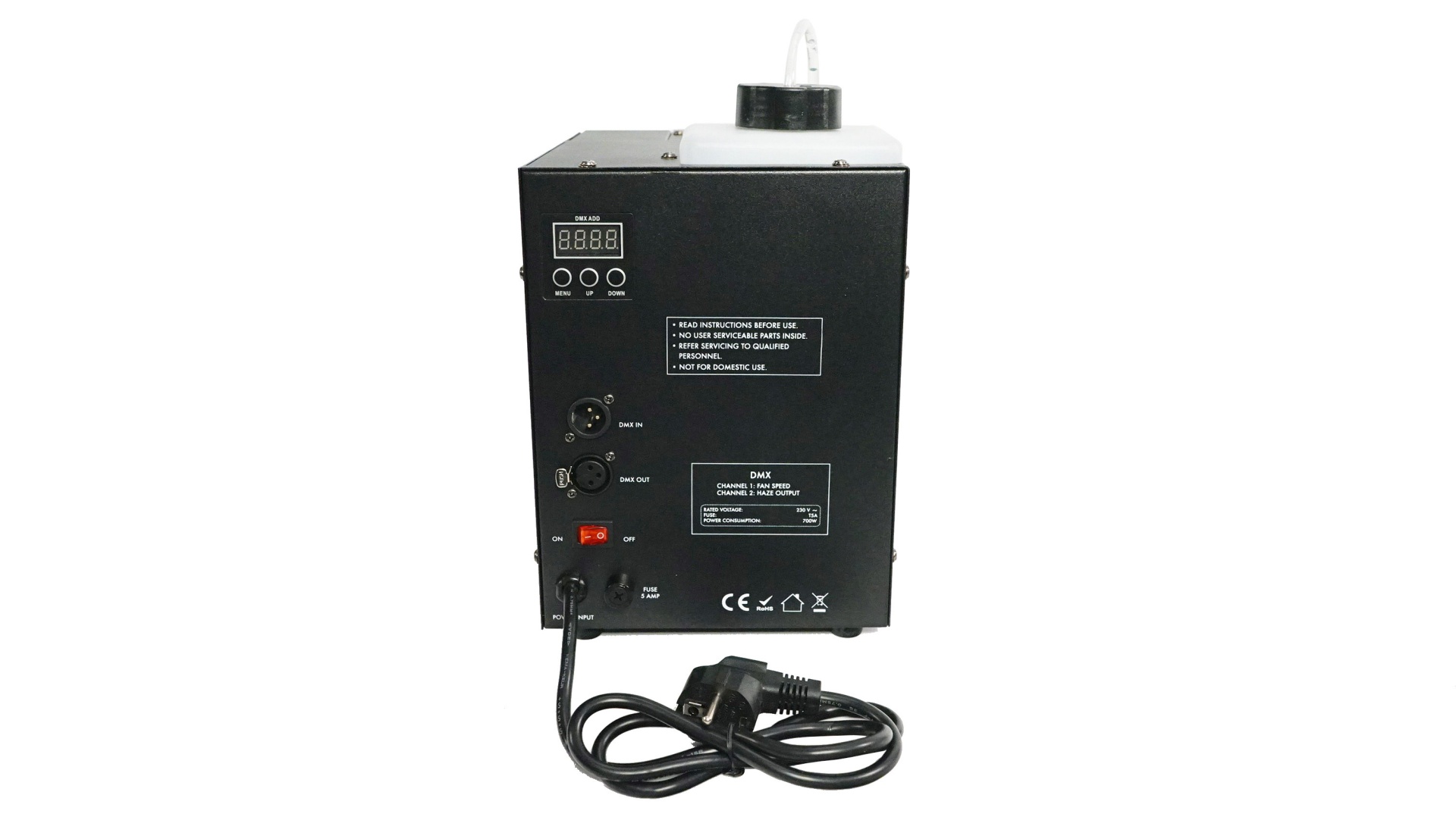 DMX512: 2 Channels: 1. Fan Speed, 2. Haze volume.