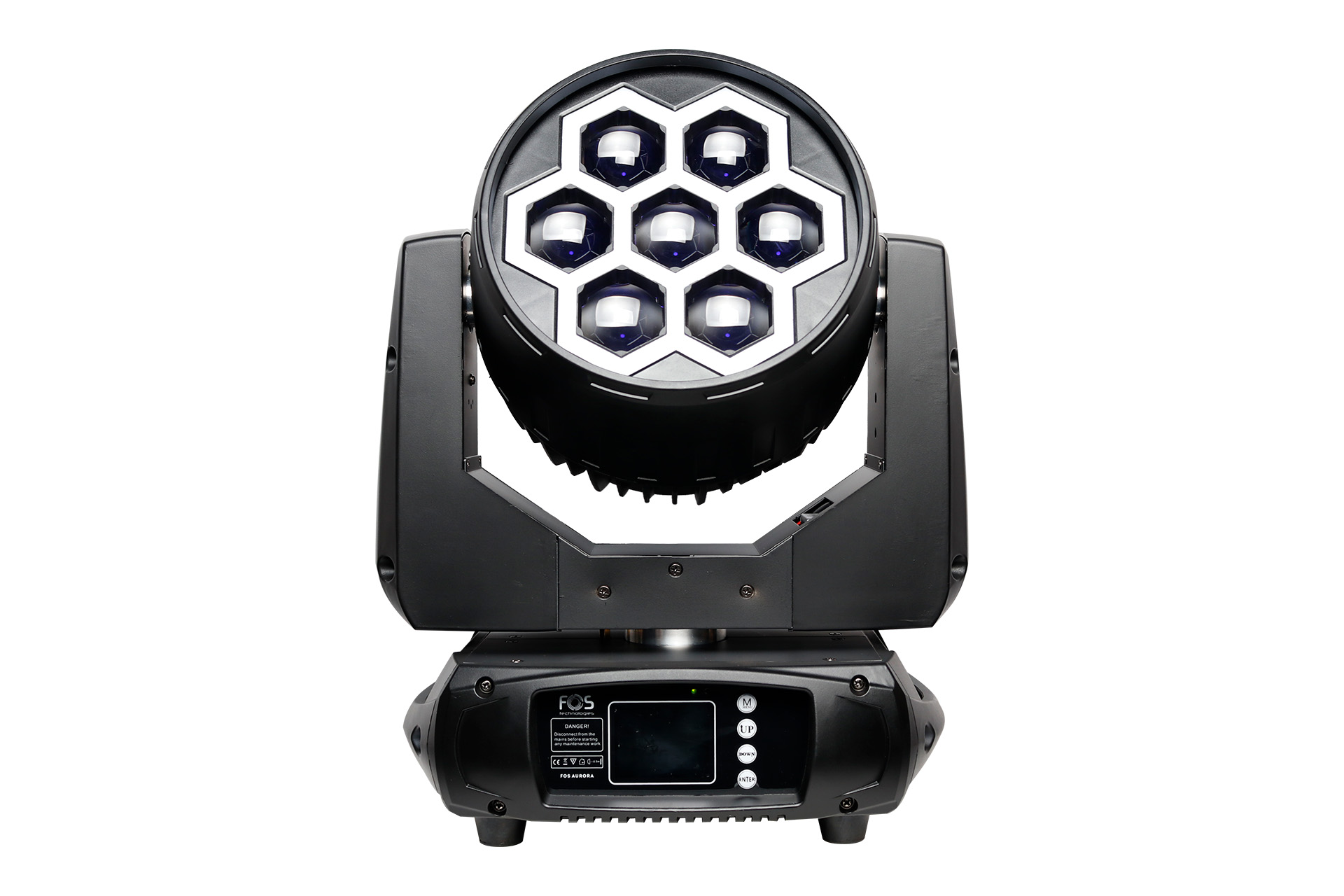 Super Bright Beam/Wash moving head, 7 leds 40watt 4in1 RGBW, 7 pixel control rings , 6-60? Electronic Zoom, graphic effect macros, 0-100% linear dimmer, powercon in/out.