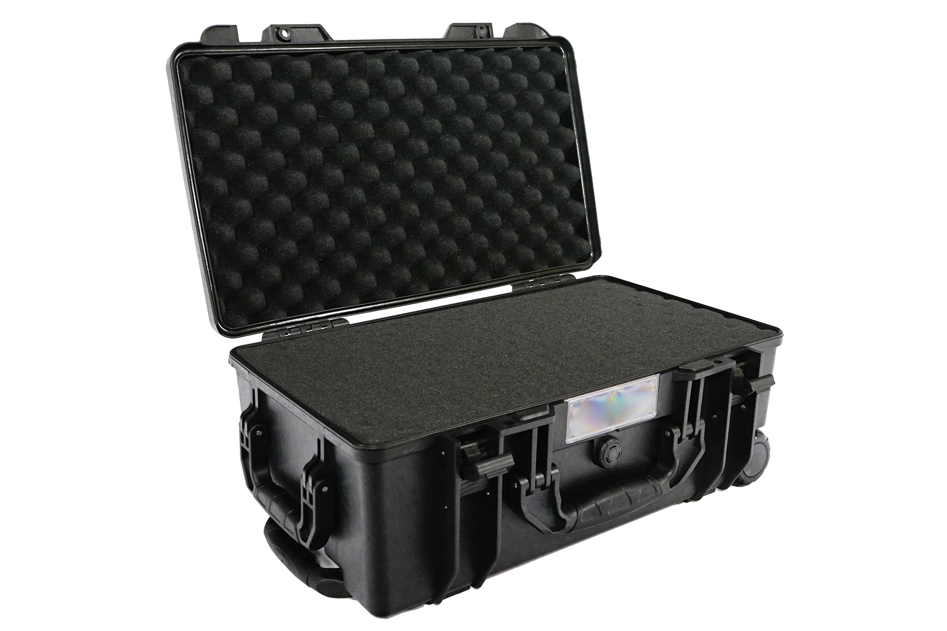 Weatherproof IP67 plastic case with wheels and folding handle for easy transport, pre cutted foam for general applications, material TSU19 resin, external dimensions 55x35x24 cm , inside dimensions 52x29x21 cm, lid depth 4.7 cm, 6 kg.