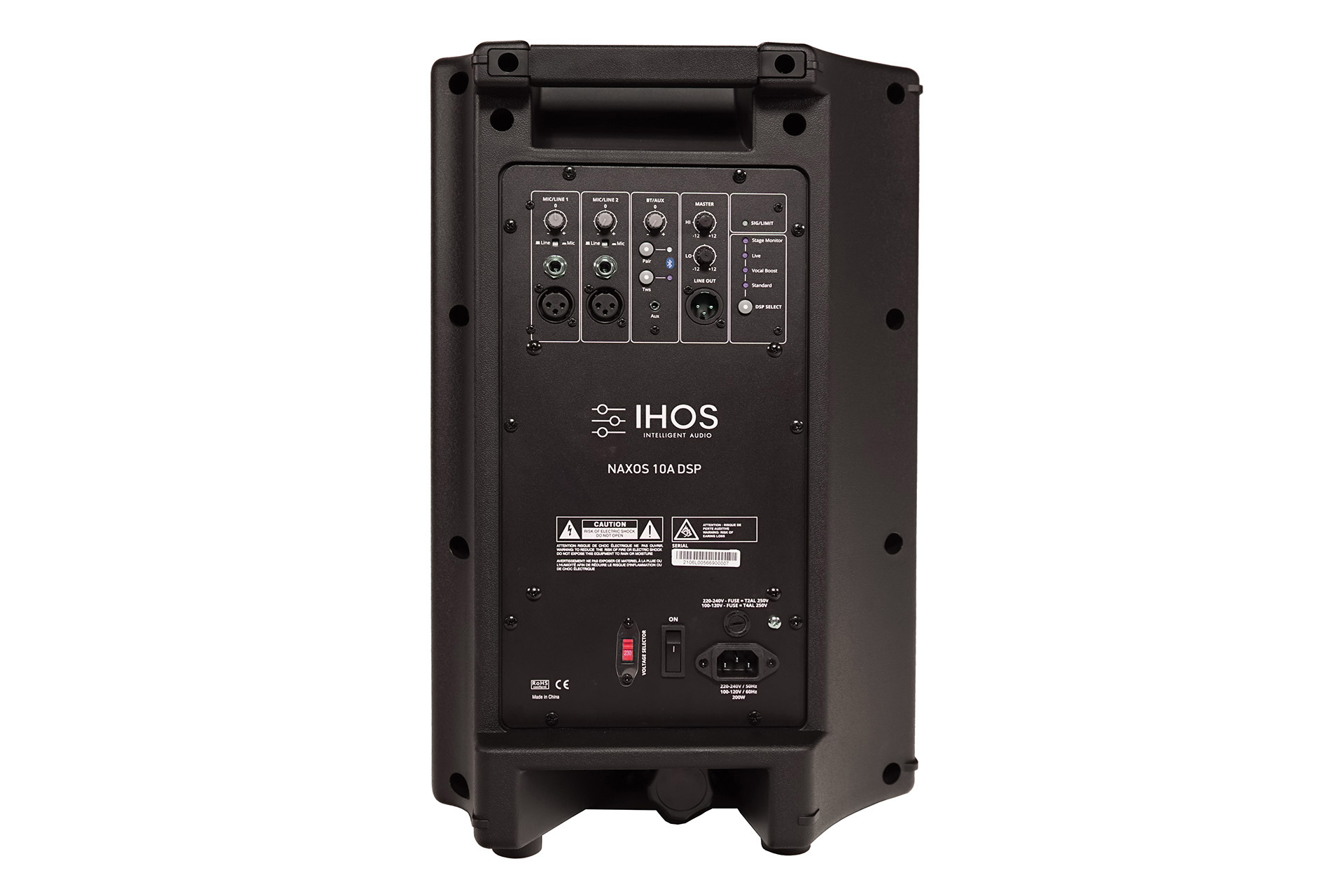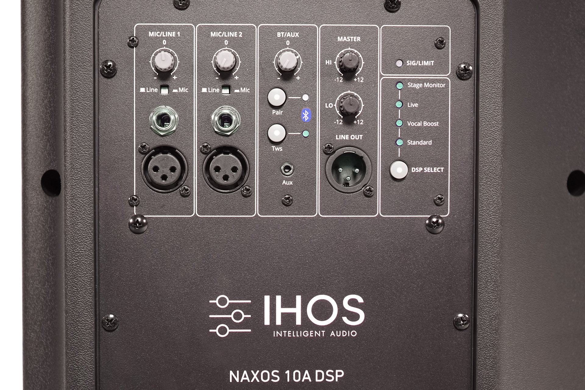2 way active full range speaker. Inputs: Bal XLR/TRS, 6.35, AUX, Bluetooth. Outputs: Balanced XLR / TWS. Power output: 150W (LF) + 50W (HF) RMS. Bluetooth version: 5.0 Power Input: 100/240 Volt AC, 50/60 Hz switchable. Features: LF: German Engineering class D, HF: Class-AB. DSP signal processing. DSP parameters: Standard, Vocal boost, Live, Stage monitor. EQ: Bass / Treble. Frequency Range: 60 - 20 kHz. Max output SPL: 123dB (at max AMP output). Impedance: LF 4Ω / HF 8Ω. 1" compression driver. 10" woofer. HPP moulded cabinet. 35mm stand pole.
