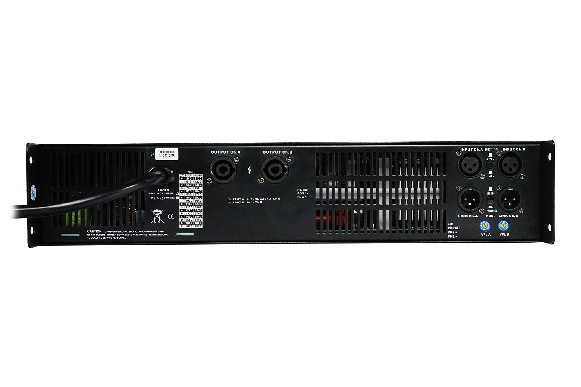 D class high performance 2 channels amplifier, 2 x1800 w/8ohms , 2 x 3600w/4 ohms, XLR input, speakon output, led VU meter, temperature control fans, frequency responce 20Hz - 34Kz,adjustable VPL, 10kg.