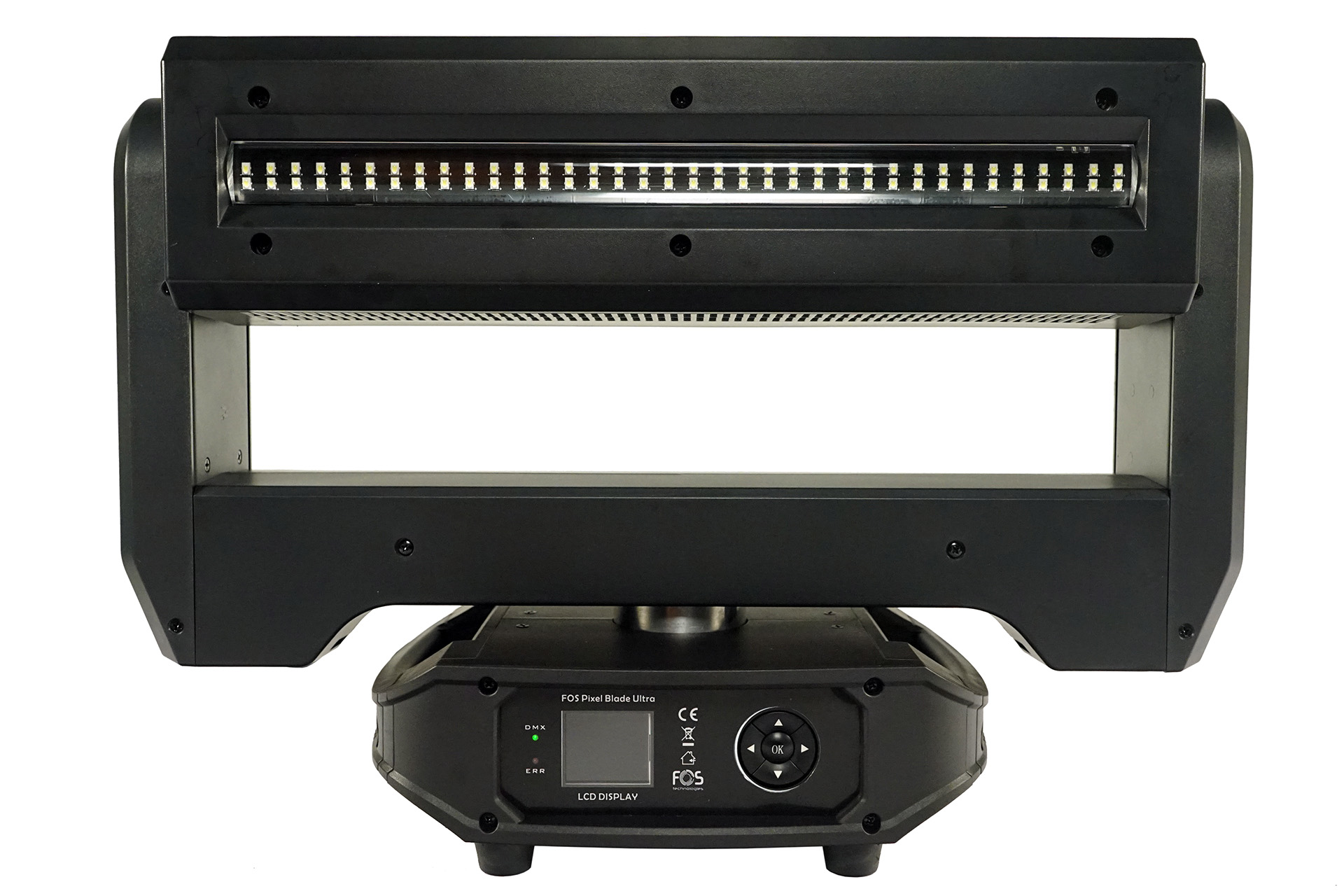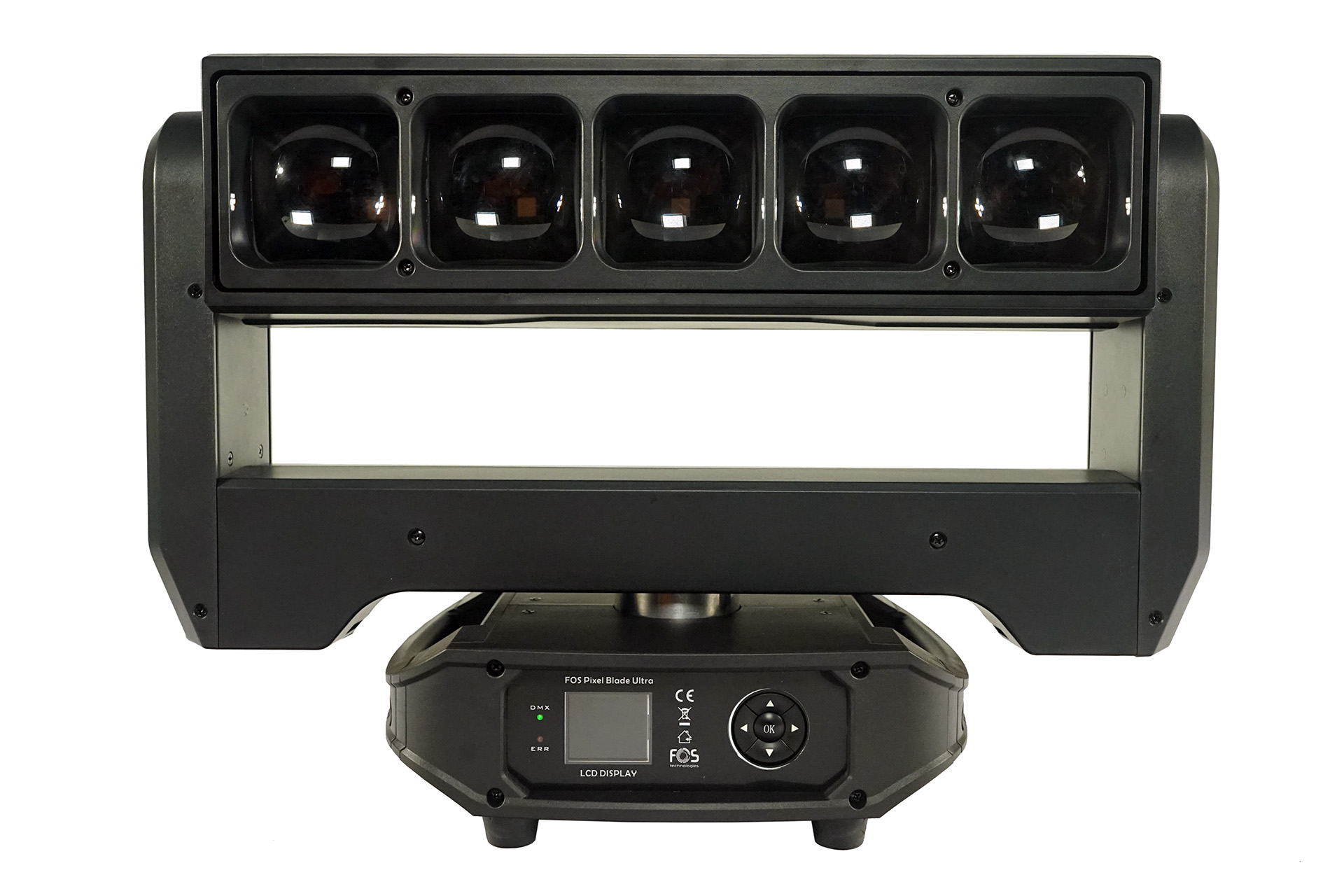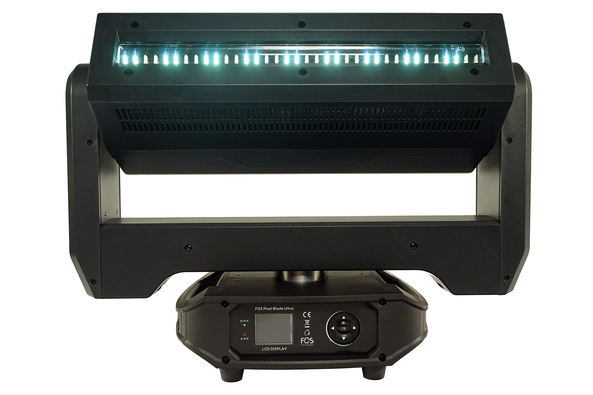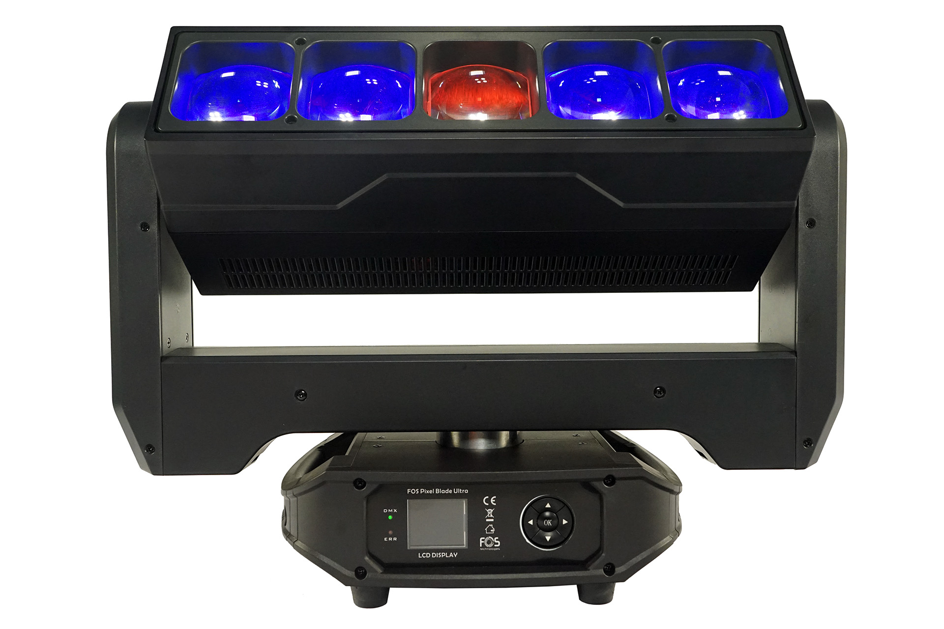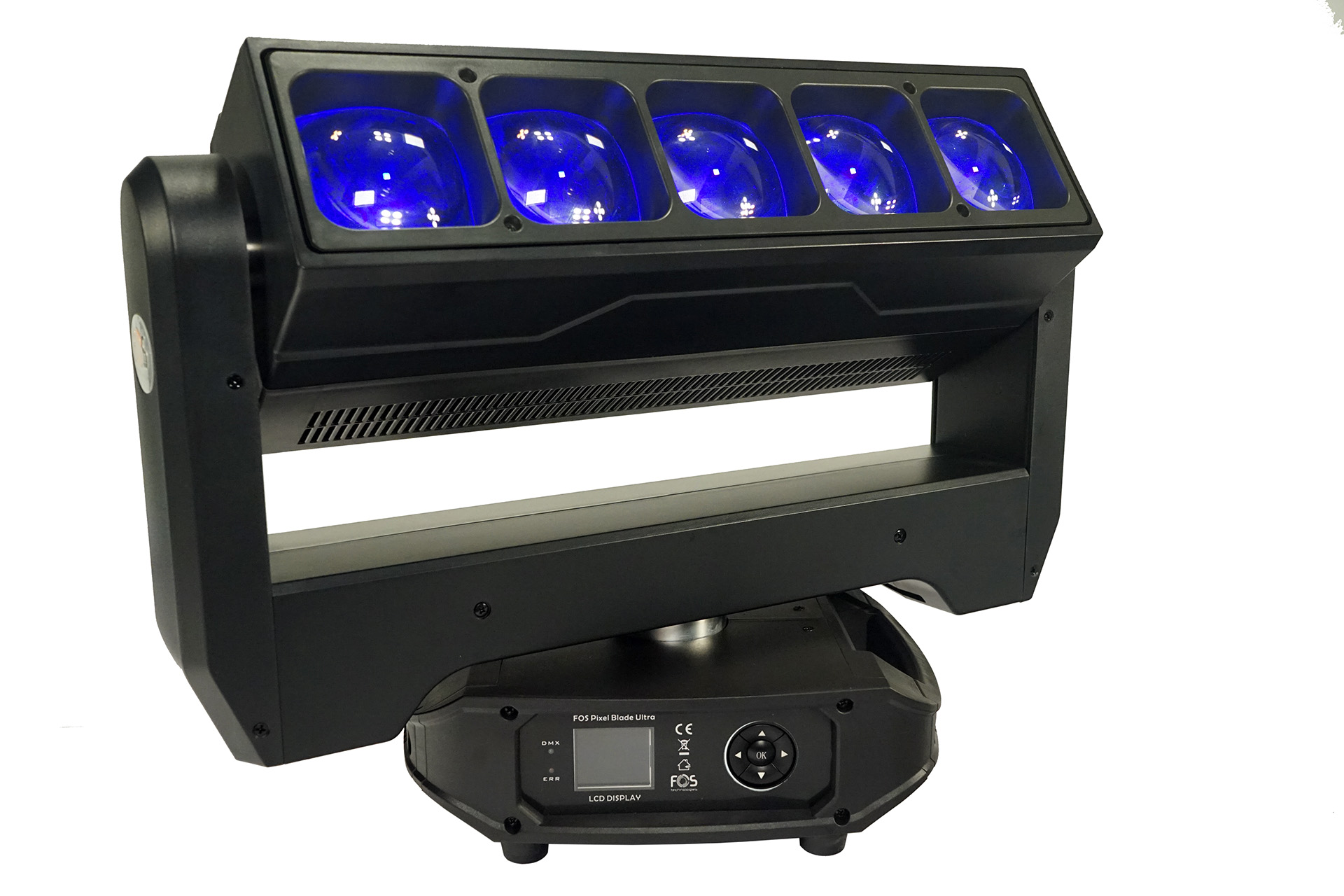 Pixel blade moving head, 5x 60W RGBW 4in1 LED, Zoom: 3.8?- 50, back side strobe:72x 3535 White LED, pixel control (18x sections for the White LEDs). Channel: 24CH/62CH, Pan Tilt infinite rotation.