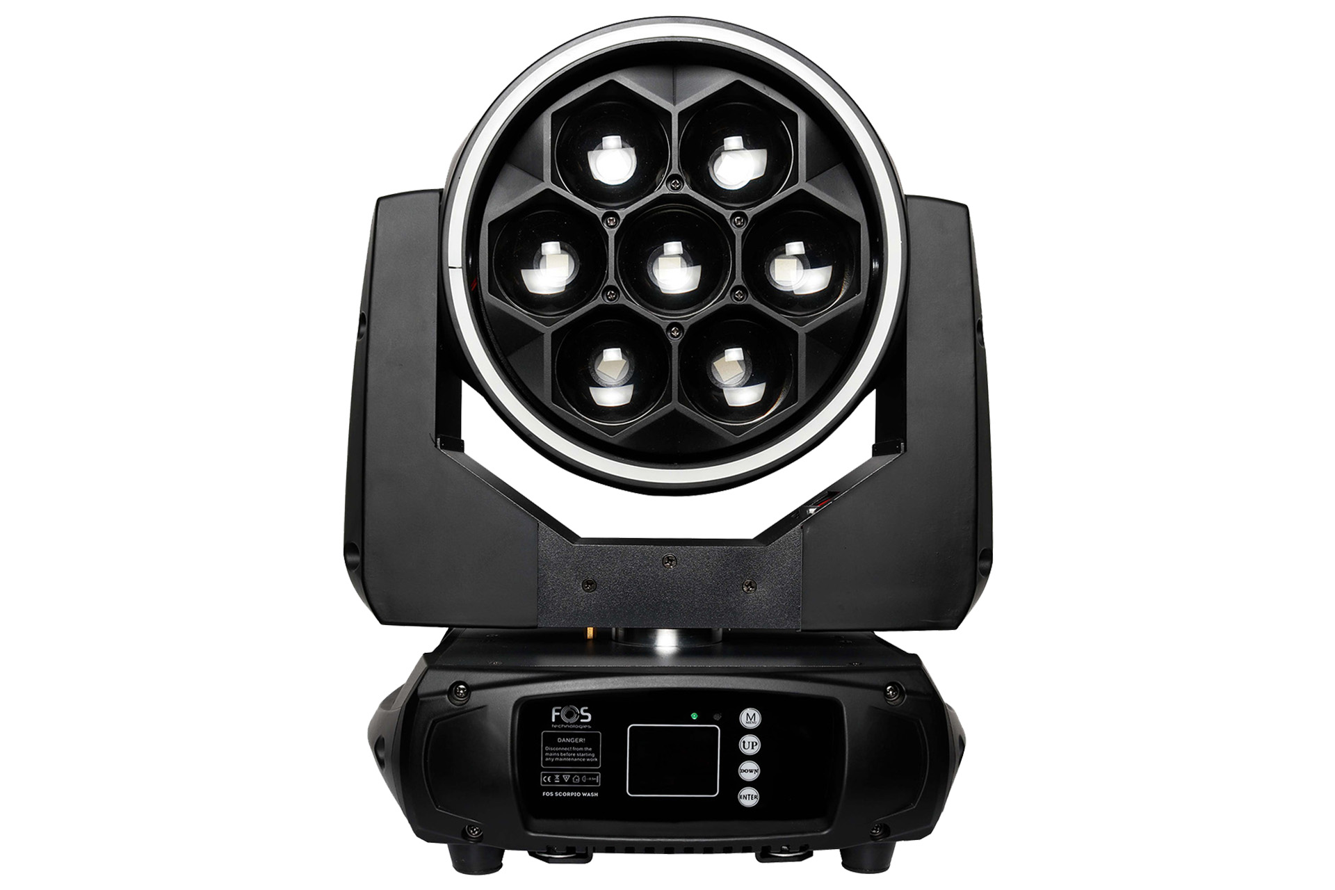 Scorpio Wash, wash light fixture, based on 60 Watt RGBW LEDs, with independent control ability. Offers linear zoom function and kaleidoscopic/multibeam effects with the rotating lens plate. The extra front RGB ring, creates a nice visual effect, with a variety of macros, especially usefull when the fixture is used in a background setup.