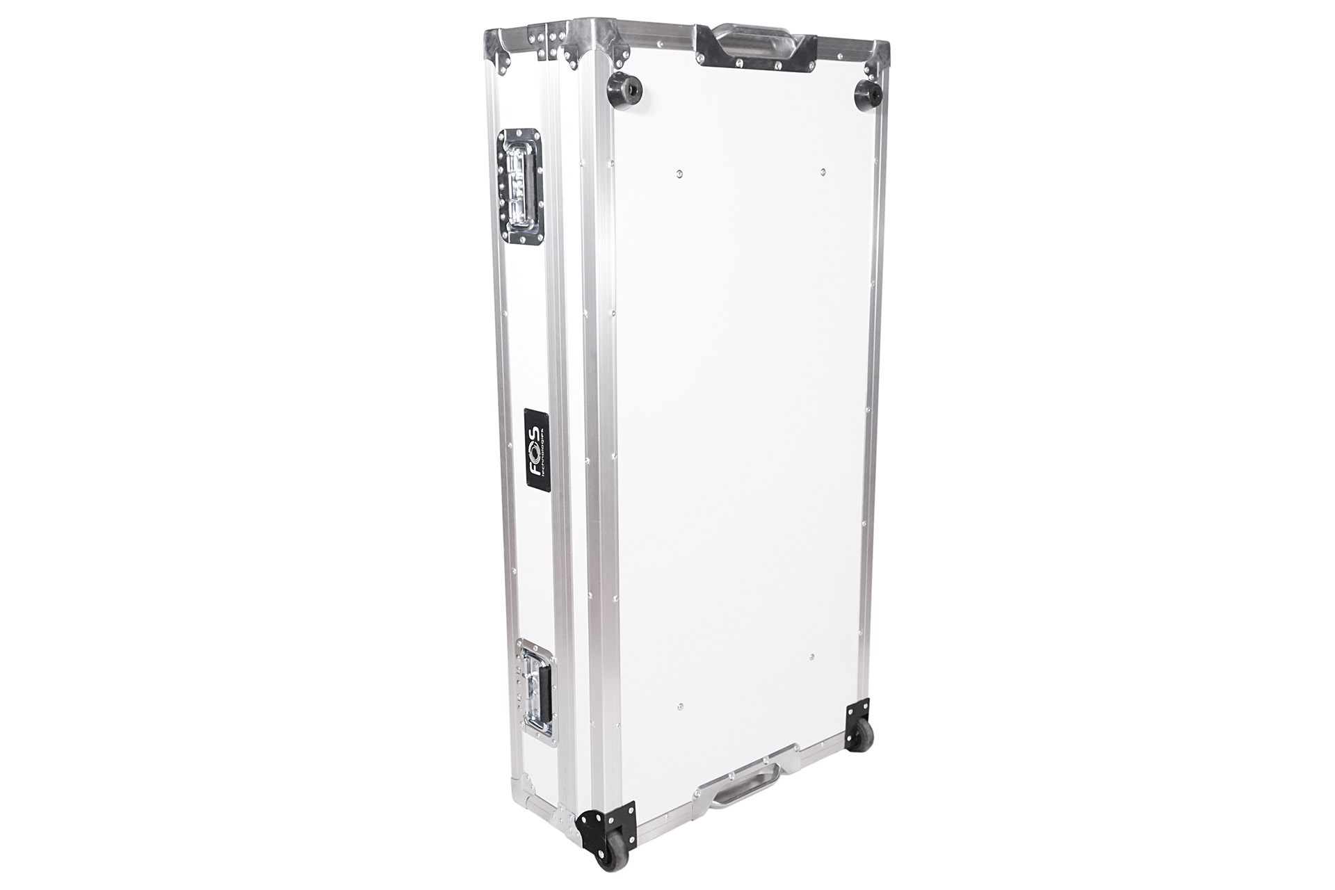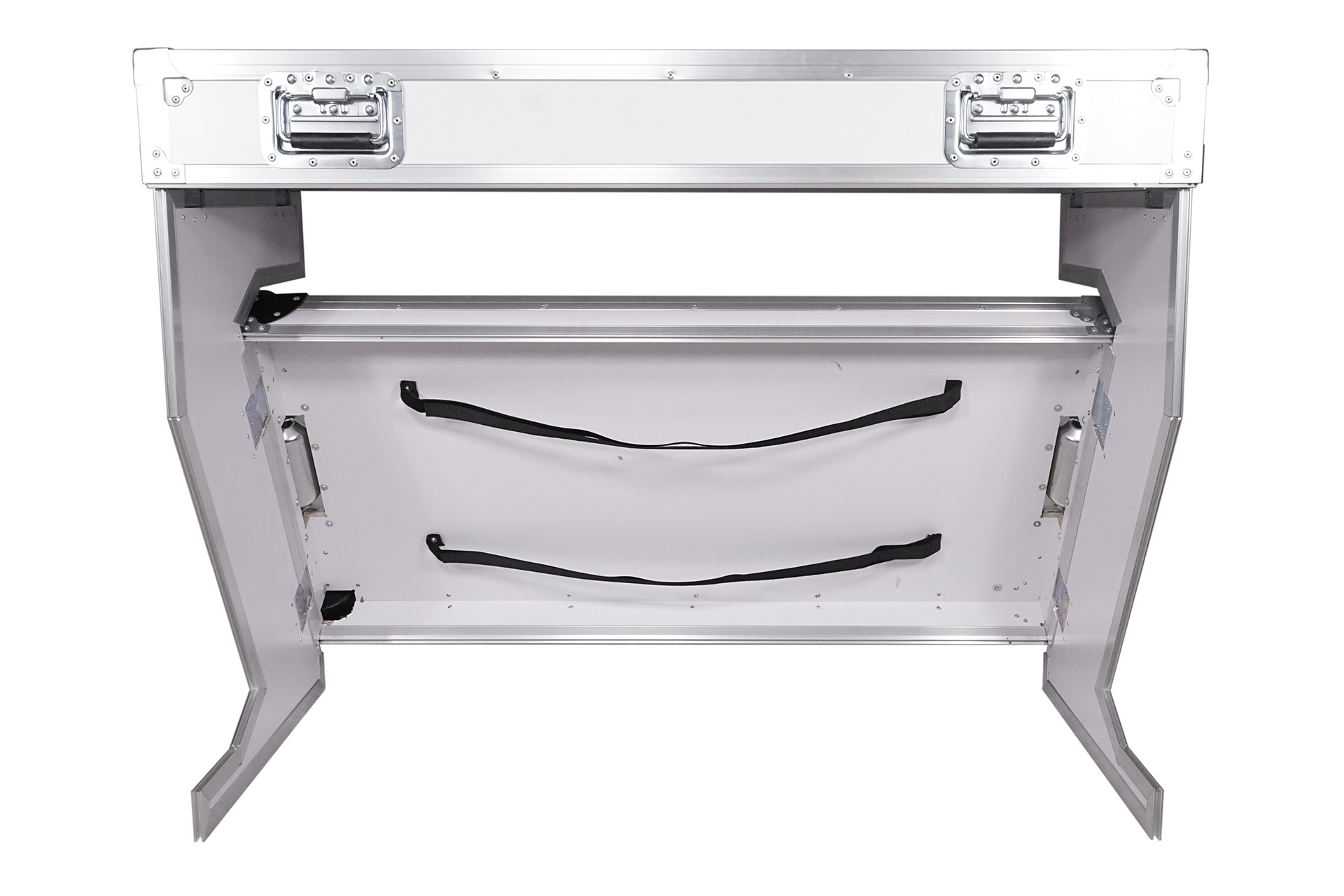Foldable Z-style DJ table flight case with handles and wheels, rendering it highly portable, simple to set up, and easy to break down for DJs . Its durable construction from white plywood with handles and wheels.