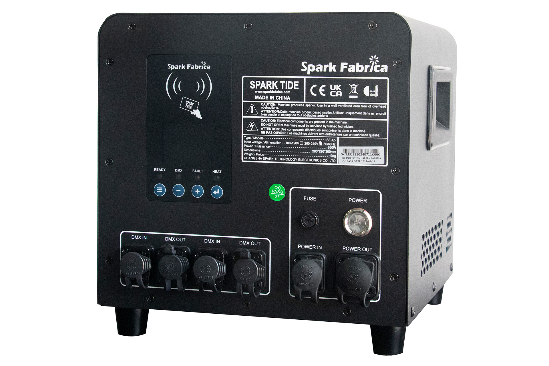 The Spark Tide SF-X5 is the world`s first version of the IP55 waterproof cold spark machine. Linear height, density, and duration, IP Rate: IP55, TFT LCD Screen, true power con and 3/5 pin In/ Out, Adjustable height: 2 - 5m , RF remote control, hopper with capacity 300gr, Stainless steel black casing, 12kg.