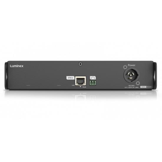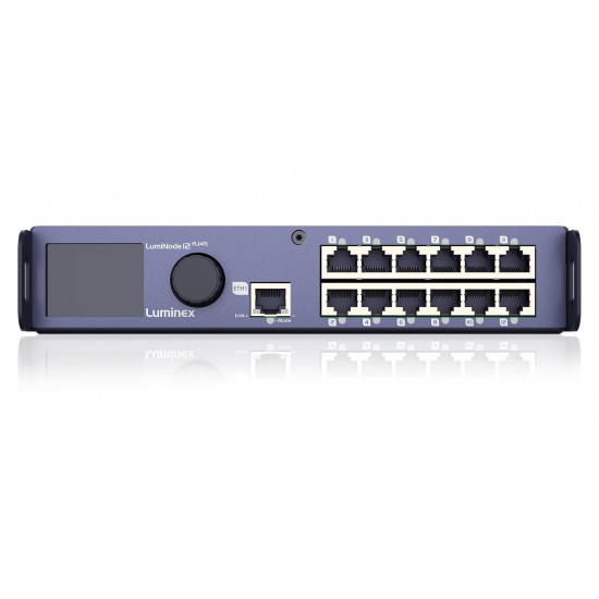 Equipped with 2x 1Gb Ethercon ports and 12x RJ45 DMX ports LumiNode 12 RJ45 offers a high DMX port count in only a half unit rack space. Each DMX port is fully optically and galvanically isolated and can be configured as an in- or output. All relevant industry standard protocols such as Art-Net, sACN, KiNET, RTTRpl (Blacktrax) are supported and can be processed and converted in 16 onboard process engines supporting HTP, LTP, Crossfade, Backup, Switch and Custom merging modes with soft patch functionality.