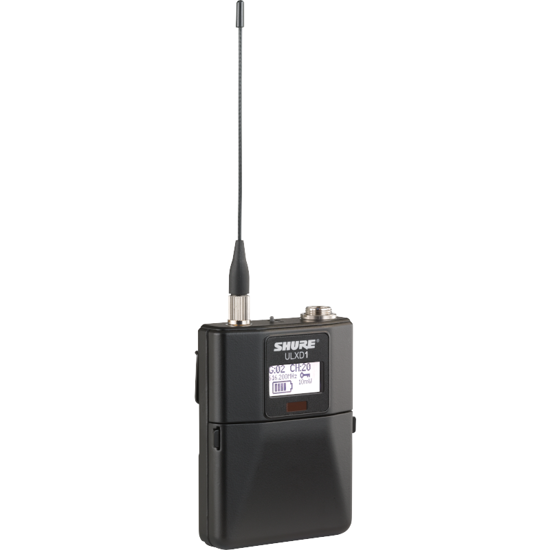 The ULXD1 is a wireless bodypack transmitter compatible with ULX-D Digital Wireless Systems. With a rugged yet lightweight aluminum case, the ULXD1 delivers uncompromising audio quality and RF performance, AES 256-bit encryption for secure transmission, and advanced rechargeability options for professional sound reinforcement applications.